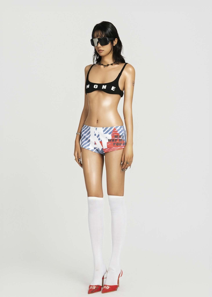 Detail: Printed graphics and lettering for accent, very short thigh-length design fully covering the backside, stretchy ribbed fabric for comfortable movement