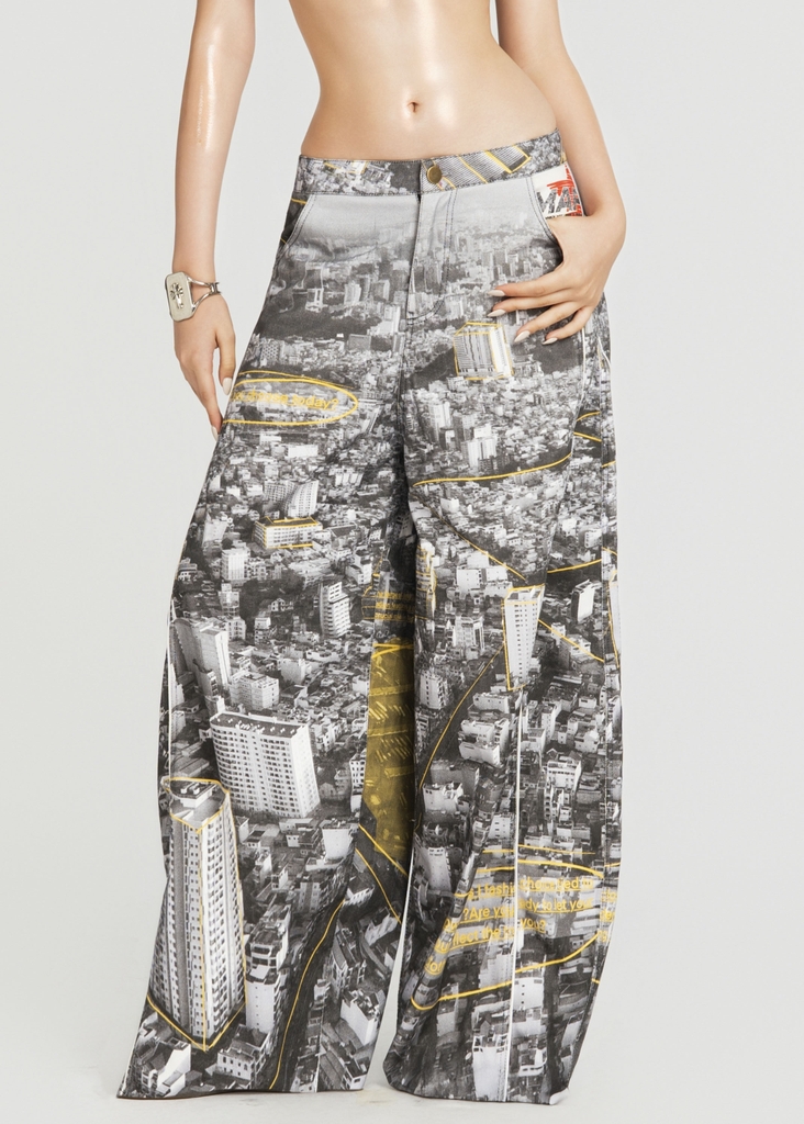 Detail: Gray printed intertwined image effect, wide-leg low-rise silhouette