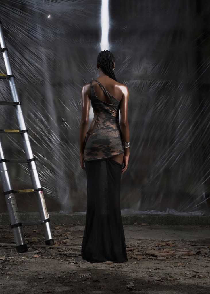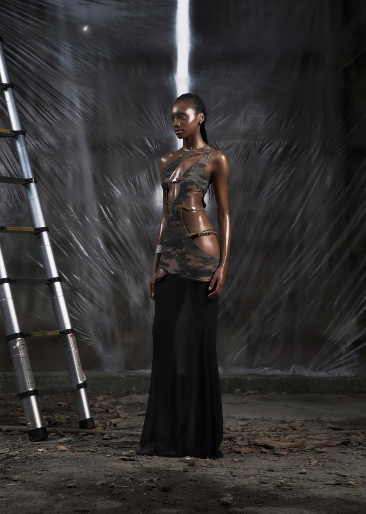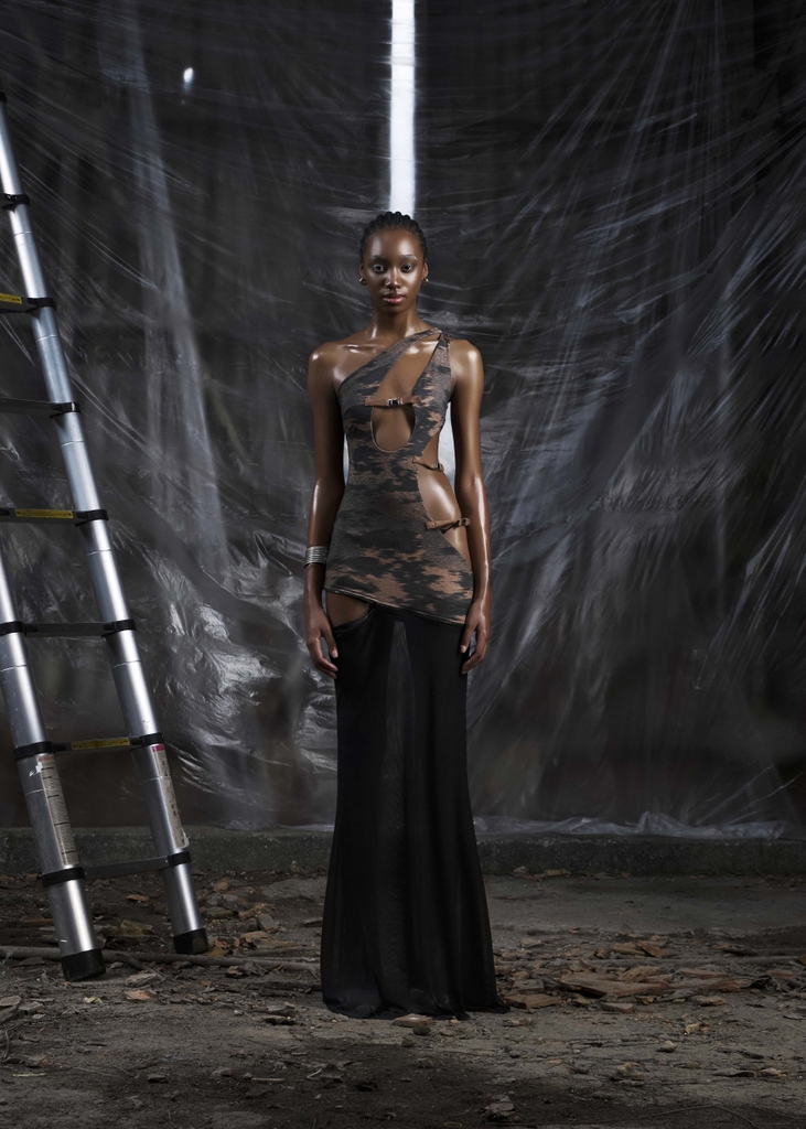 Detail: Brown print all over the dress, off-shoulder collar on the right shoulder, vertical zipper detail from the front chest to the waist, detachable skirt part with zipper