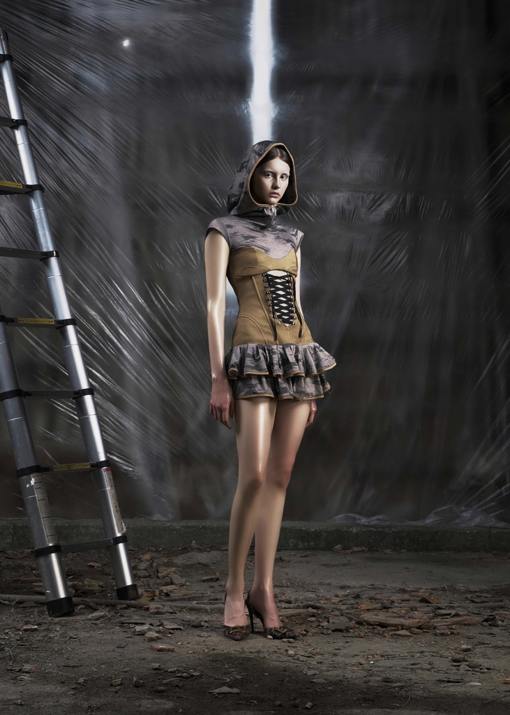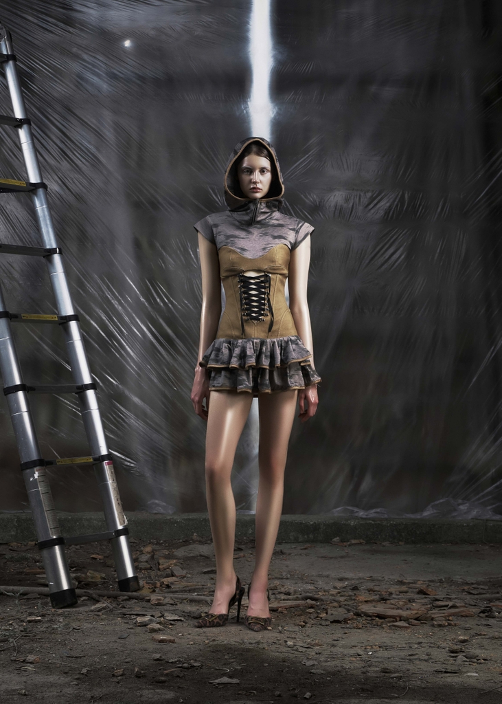 Detail: Gray-brown printed pattern, including hood with zipper, padded shoulders, corset body with lace detail at the waist, multi-layered skirt, zipper at the back