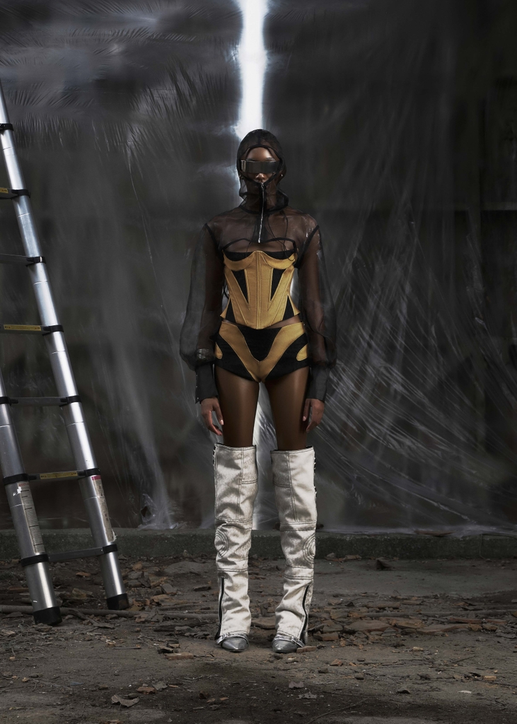 Detail: Lace pattern along the corset. The bust cups hug and support the body, flares slightly at the waist end, has a zipper in the back