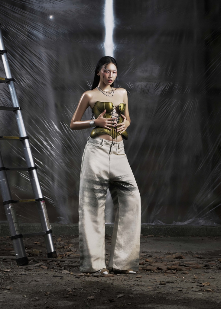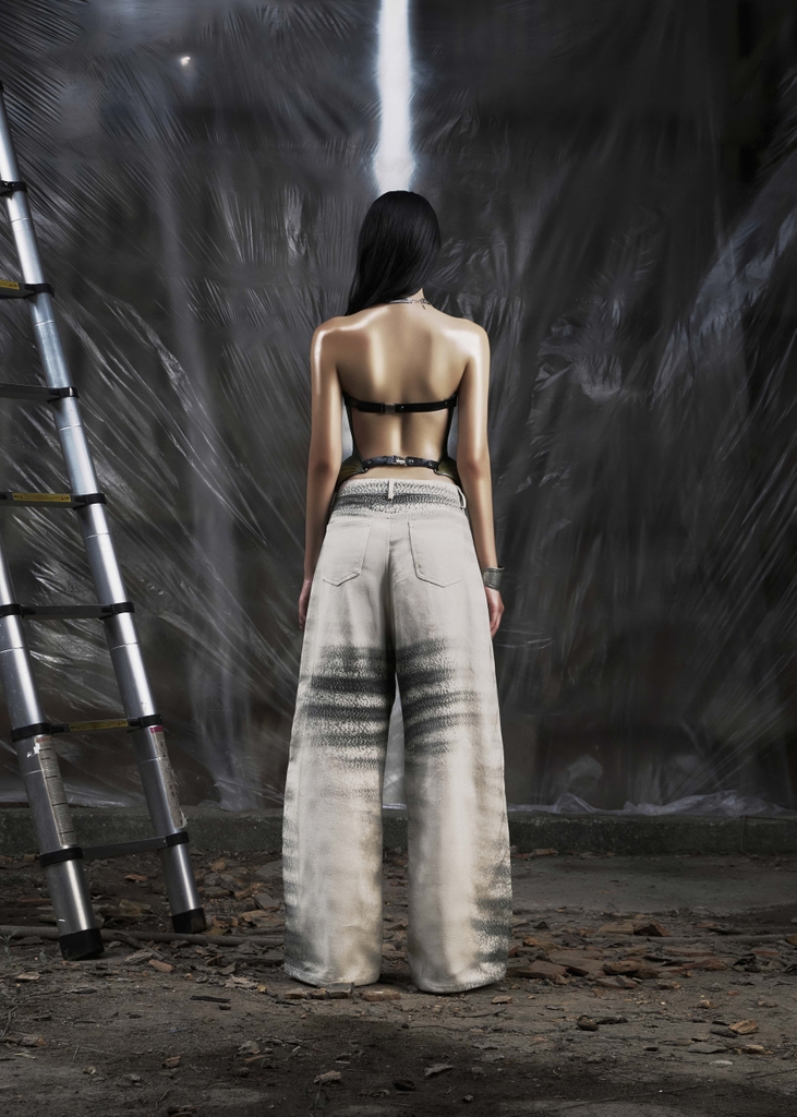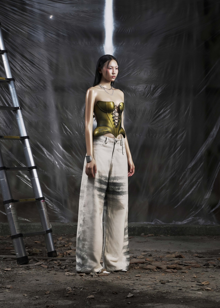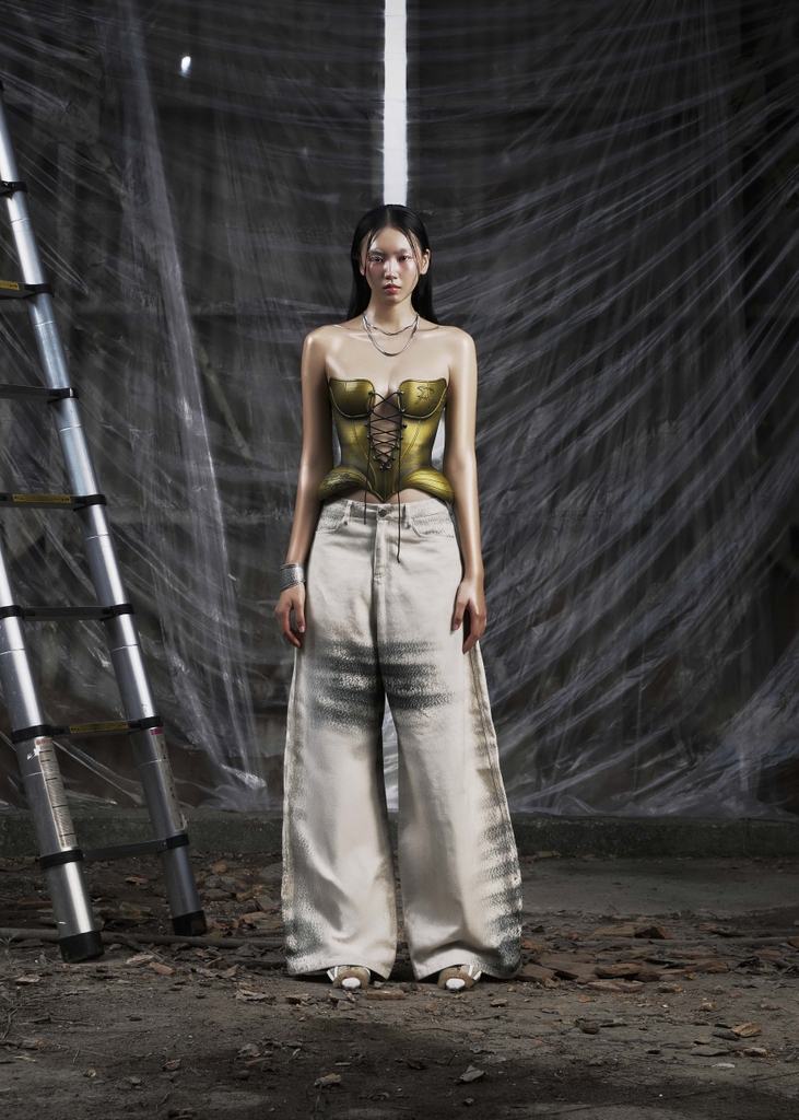 Detail: Hand-printed color, bustier shape, flared waist, front lace band, open back with leather lace band, printed graphic pattern