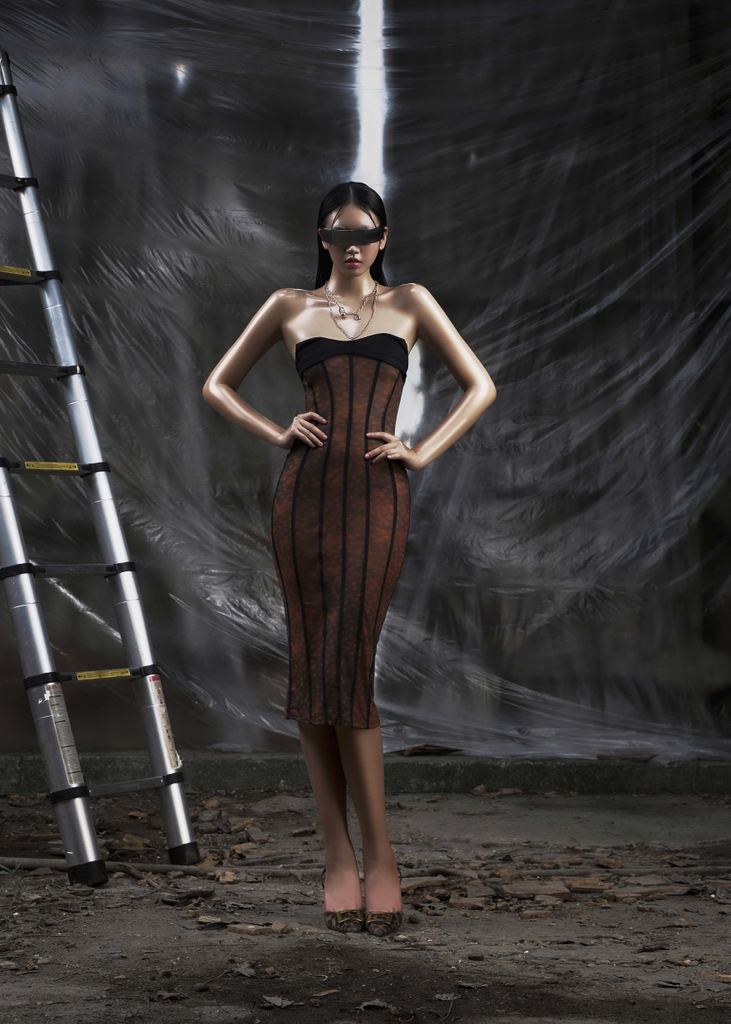 Detail: Amber print, black tight-fitting bust with metal buckle at the back, striped details that hug the entire dress, body-hugging form