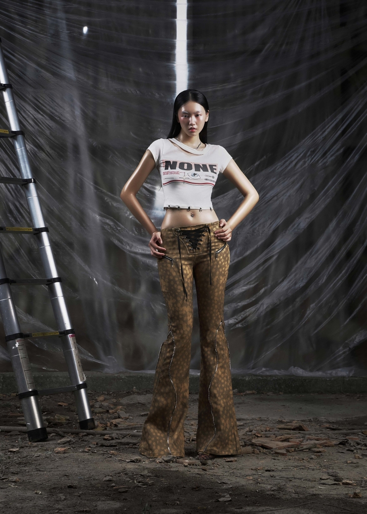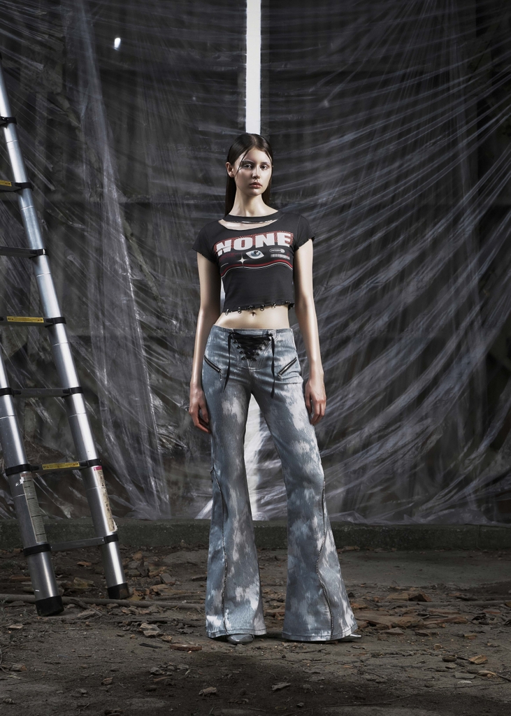 NONE Torned Neck TshirtMaterial: ElasticDetail: Printed pattern on front chest, right shoulder cutout collar, hem with metal zipper aroundSize: S M LVersion: White/Black